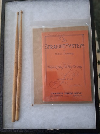 The Straight System, printed in 1936, from Frank's Drum Shop in Chicago, with a pair of Leedy & Ludwig 1a sticks. Condition is used on the cover, internal pages are excellent. Sticks are used. Former owner was Bernard Quick.